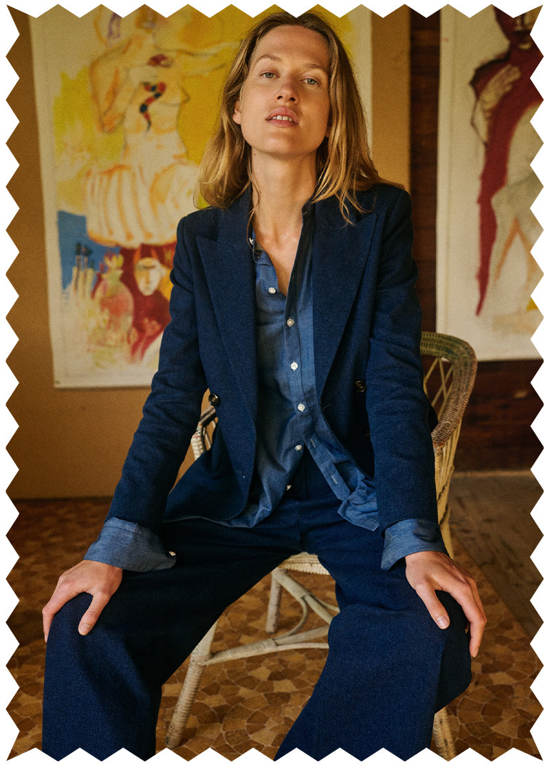 For Drop 7, we’ve reimagined the classic blazer in rich dark wash denim — combining rugged texture with tailored sophistication. This double-breasted design features a structured yet comfortable fit that shapes the silhouette without feeling stiff, making it perfect for layering in cooler weather.