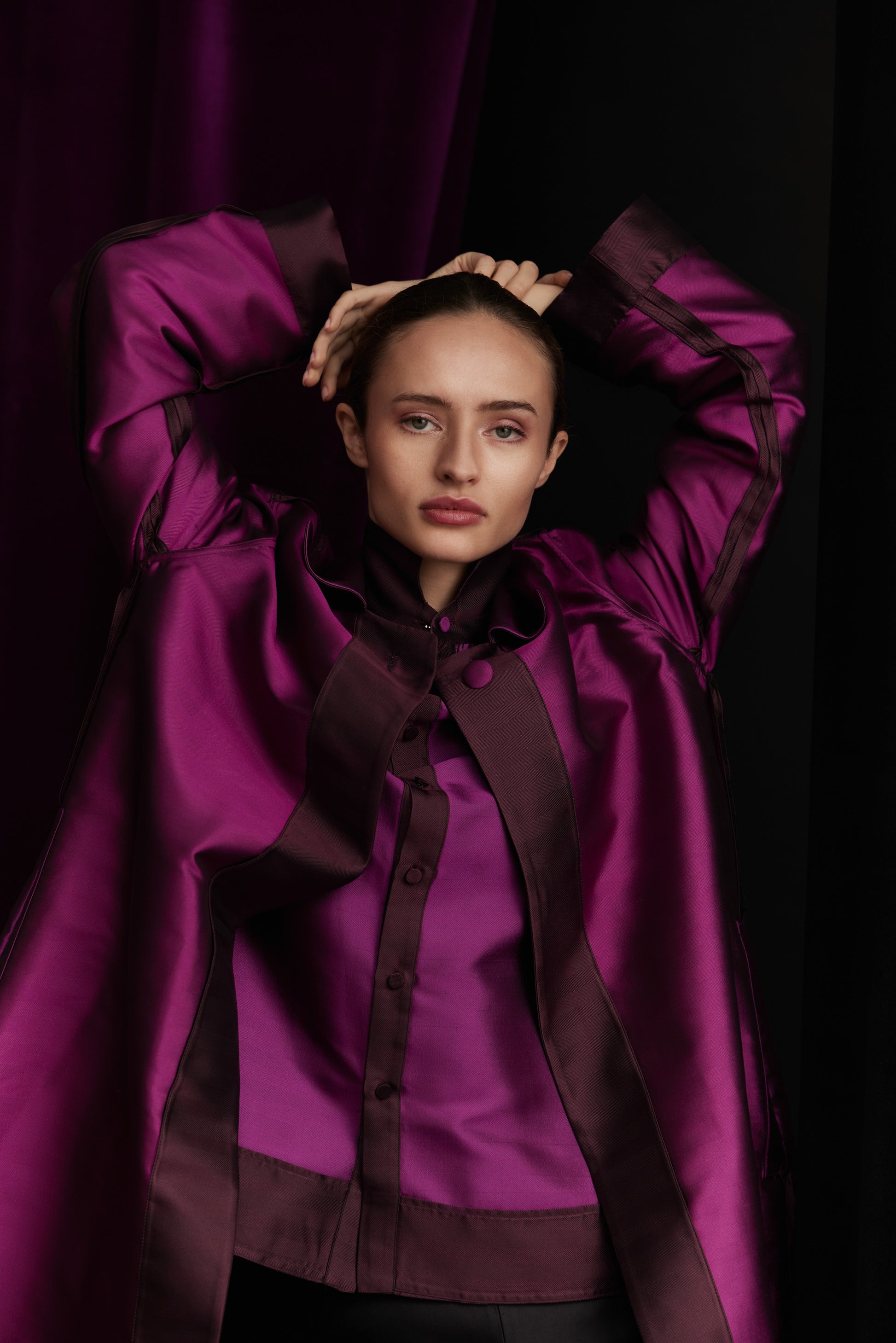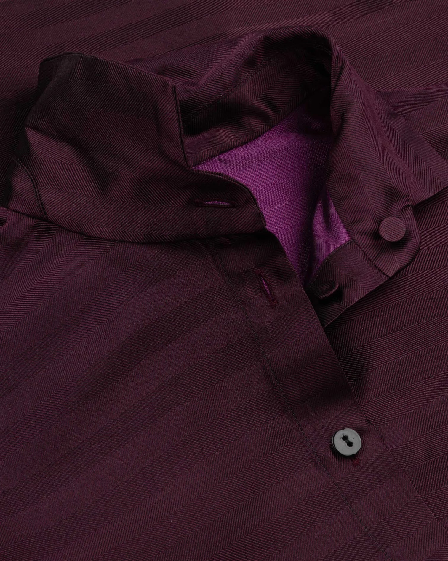 Talking about luxury and versatility, our "Pocket Shirt" is the true embodiment of refined elegance, perfect for evening wear and beyond. Crafted from the finest silk, typically reserved for the most exquisite ties, this jacket shimmers in shades of burgundy and violet, catching the light with every movement.